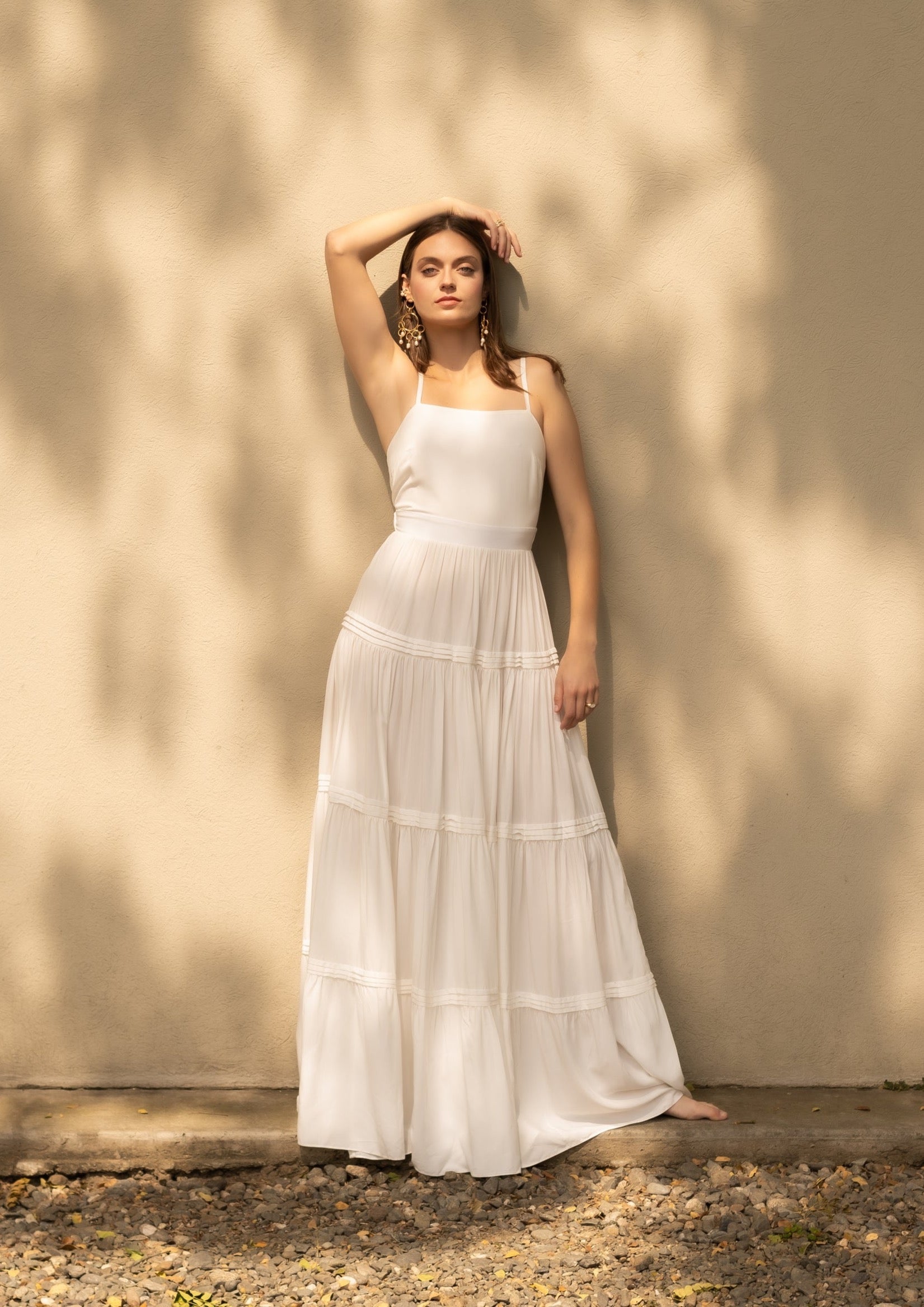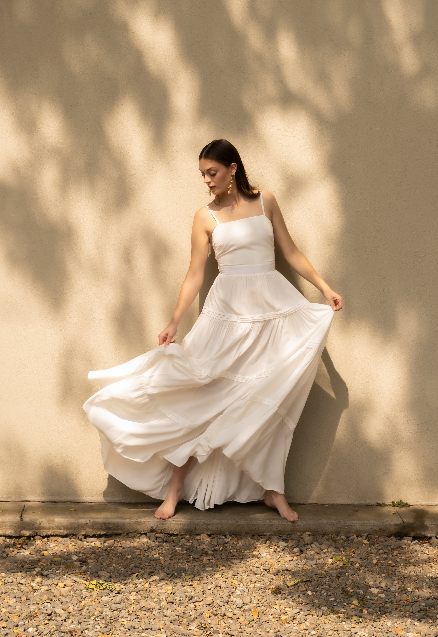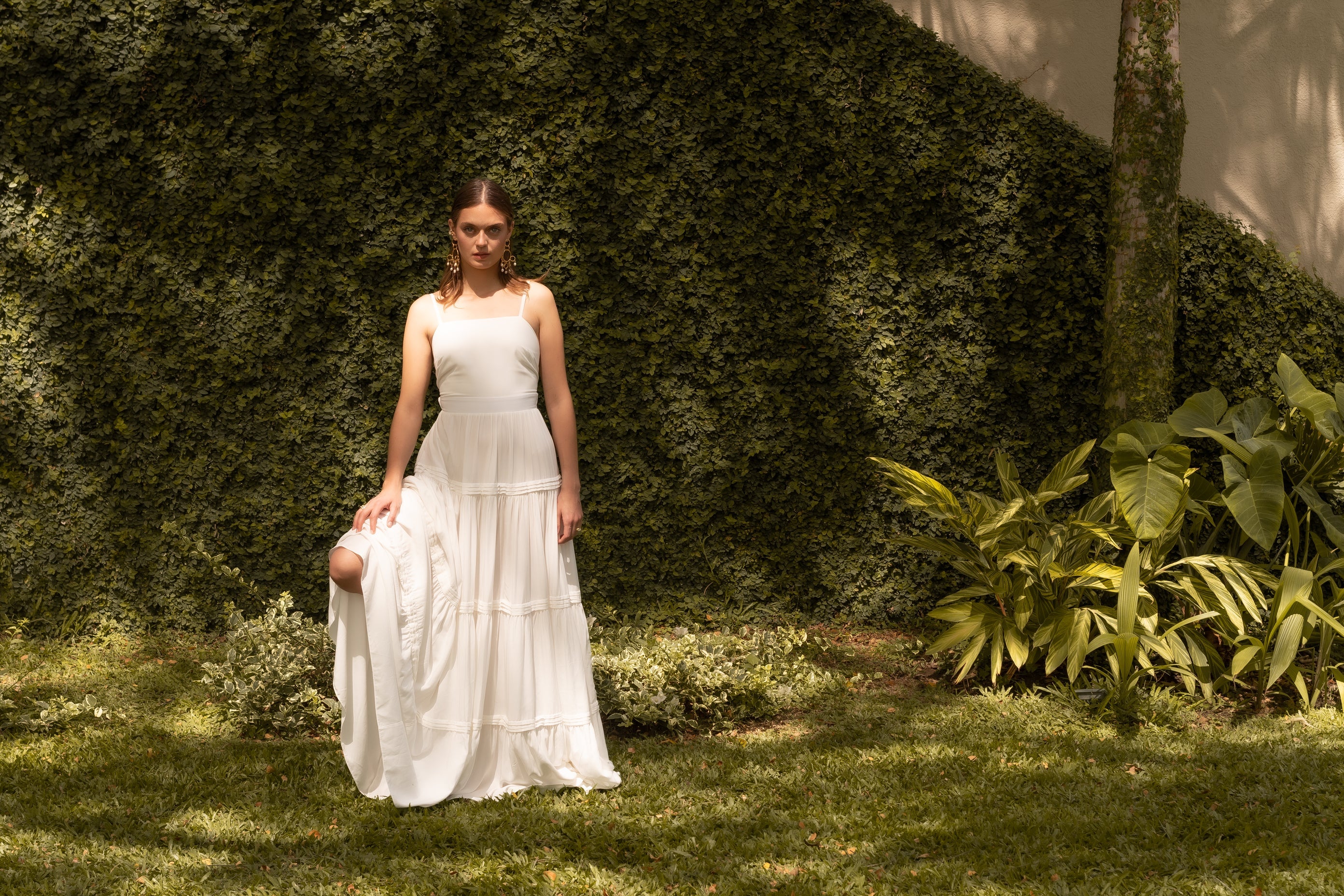 Este vestido está diseñado para aquellas mujeres elegantes, delicadas y clásicas que buscan siempre sentirse frescas y cómodas sin dejar a un lado su estilo. Marie Curie, es un diseño largo y con mucho movimiento que realza la cintura y le da delicadeza a la espalda con un moño sutil y ajustable.