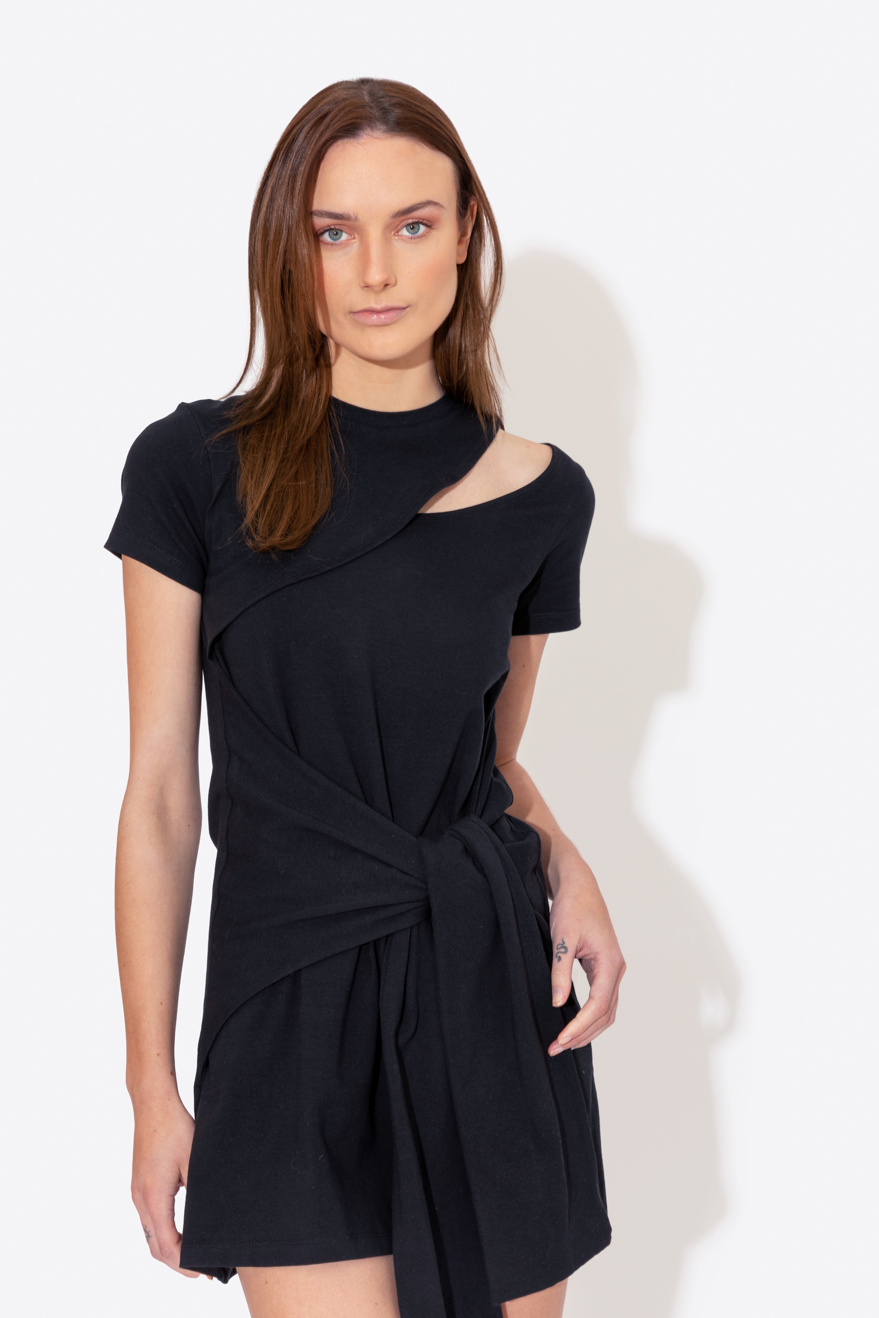 Vestido de camiseta negra hecha con lycra ligera de alta calidad, cuello circular y abertura en el hombro izquierdo.