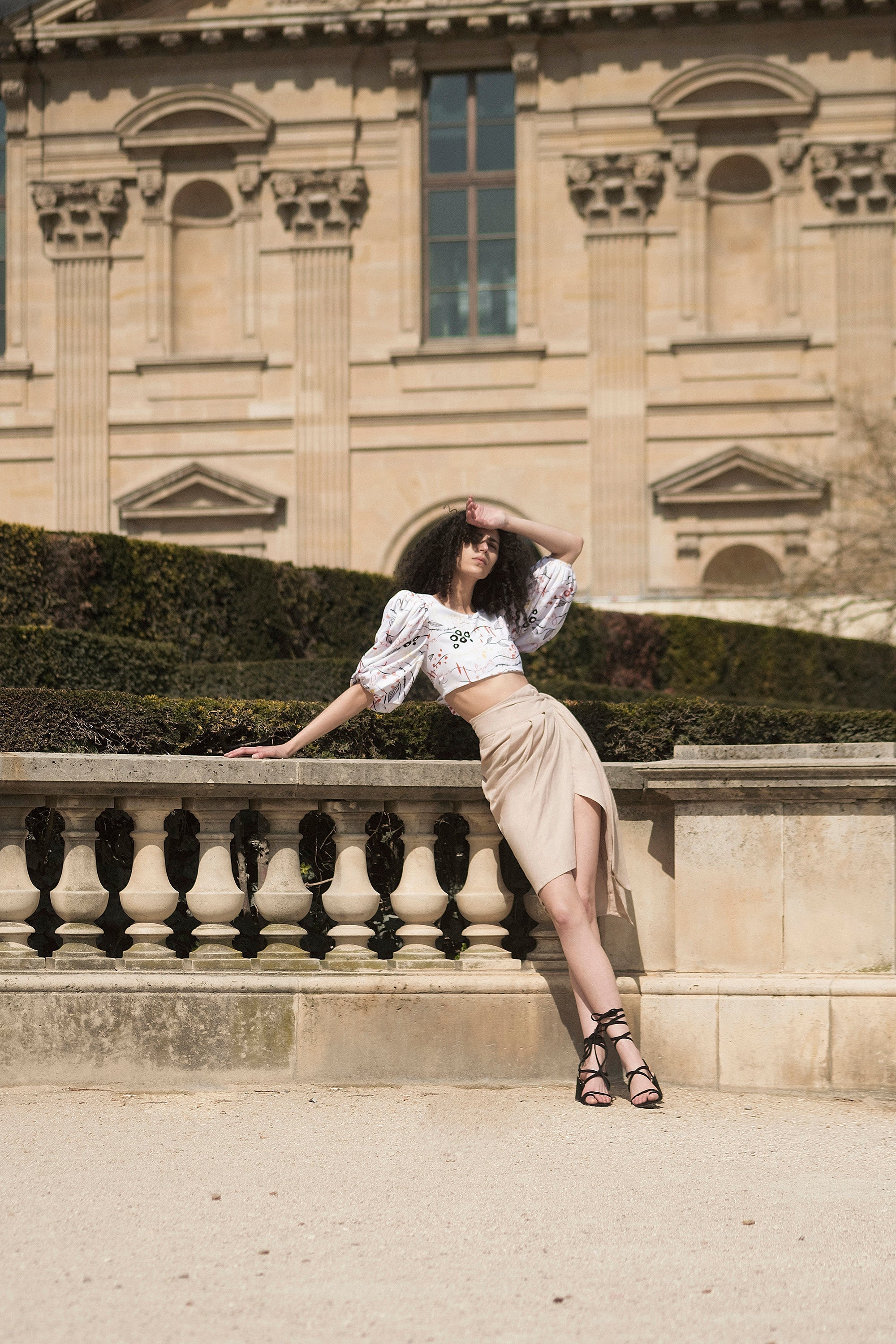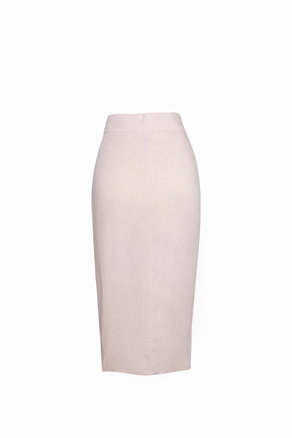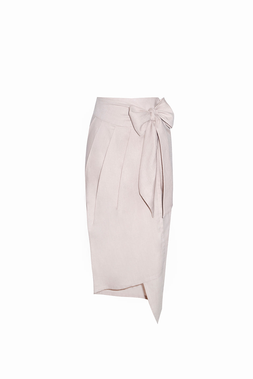 Altura de la falda asimétrica sobre la rodilla, con la apertura al frente, los detalles drapeados y el amarre en el frente. Base: lino.