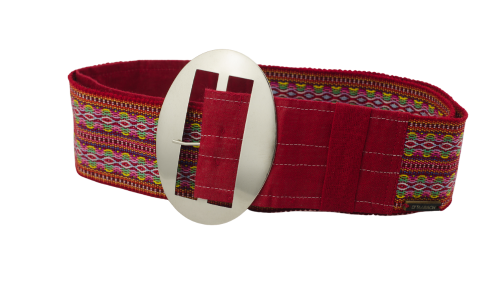 Cinturón artesanal sustentable inspirado en las tradiciones andinas, elaborado a partir de una faja tejida a mano por artesanos ecuatorianos y lino con acabado de puntada frontal. La costura frontal del cinturón se inspira en los campos y cultivos. Es un cinturón de mujer único que rompe la monotonía y aporta estructura y definición al look.