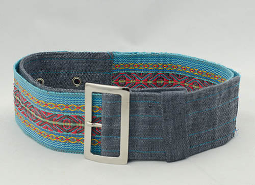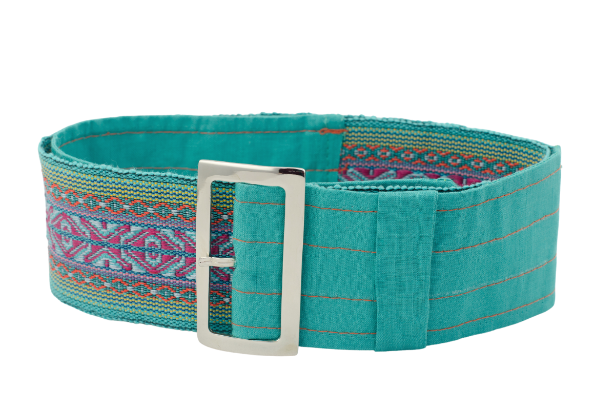 Cinturón artesanal sustentable inspirado en las tradiciones andinas, elaborado a partir de una faja tejida a mano por artesanos ecuatorianos y lino con acabado de puntada frontal. La costura frontal del cinturón se inspira en los campos y cultivos. Es un cinturón de mujer único que rompe la monotonía y aporta estructura y definición al look.